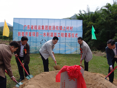 2010年4月27日,省航运集团对口帮扶的丰顺县汤坑镇上村村鼓乐喧天,集团帮扶上村村建造的水利灌溉工程举行了简单而热烈的奠基仪式。集团党委书记、董事长刘伟清、监事会主席姚木成及有关部室,丰顺县委书记姚森隆、县委常委徐庆青、副县长蔡琳以及县、镇相关领导和上村村干部、村民代表等参加了仪式。