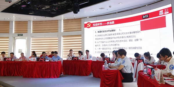 活动开始前,会场播放了《我宣誓》,并播放了支部展示的视频介绍,立刻把与会人员带入到庄严肃穆、铿锵有力的现场气氛中。随着党建知识竞赛环节开始,各参赛队伍闪亮登台亮相。集团本部、各下属公司中涌现的9个优秀党支部组队踊跃参赛,“航城追梦队”、”活力湛航队“等队伍陆续出场,“党团在我心,共筑航运梦”,“旅运一支部,百舸争一流”、“粤通粤通,勇攀高峰”、“开拓创新,争创价值”等口号和昂扬向上的精神面貌博得全场观众的阵阵掌声。