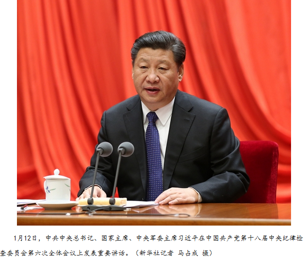 中国共产党第十八届中央纪律检查委员会第六次全体会议于1月12日在北京开幕。中共中央总书记、国家主席、中央军委主席习近平发表重要讲话。