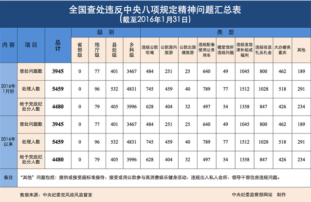 按问题类别划分,和去年12月一样,违规发放津补贴或福利问题依然比较严重,在查处问题数、处理人数和给予党纪政纪处分人数上依然排在首位,分别是1045起、1512人和1358人。而违规收送礼品礼金问题和违规配备使用公务用车问题则紧随其后,排在较突出问题的前列,这三类问题占到查处问题总数的近63%。(来源:中央纪委监察部网站)