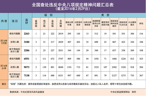 为掌握全国贯彻落实中央八项规定精神情况,中央纪委在31个省区市和新疆生产建设兵团、139个中央和国家机关、111个中央企业、15个中央金融企业建立了落实中央八项规定精神情况月报制度。2016年以来,截至2月29日,全国查处违反中央八项规定精神问题情况如下: