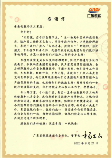 在全球疫情暴发的严峻形势下,集团广大驻外员工逆风而行、迎难而上,驻守一线,全力保障驻外工作安全稳健运转,以实际行动践行使命,以奉献诠释担当,展现出了广航人“与水为善,航润天下”的精神。近日,集团工会积极开展“情满中秋,感谢一路有你”驻外员工家属慰问活动,把一项项务实的举措、一份份暖心的关怀,送给疫情期间奋战在外的员工家属。