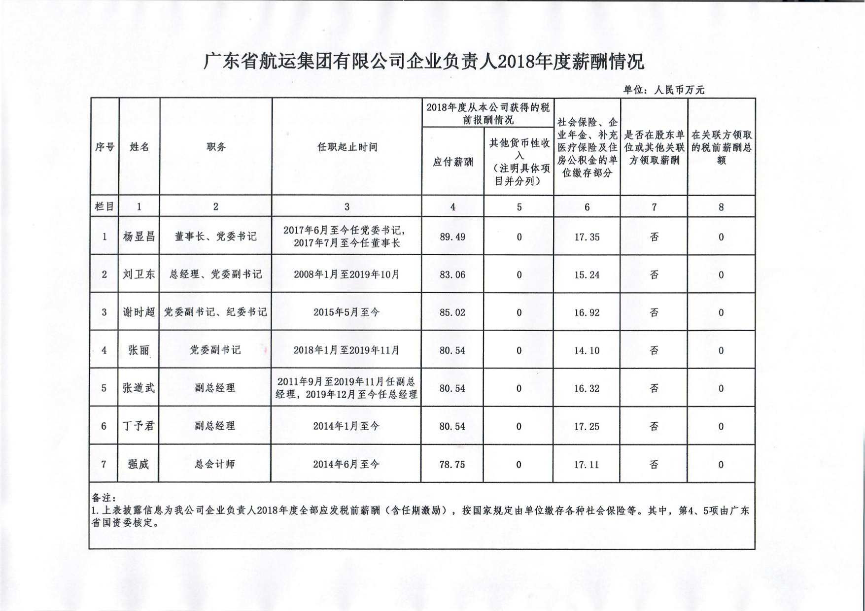 广东省航运集团有限公司企业负责人2018年度薪酬情况