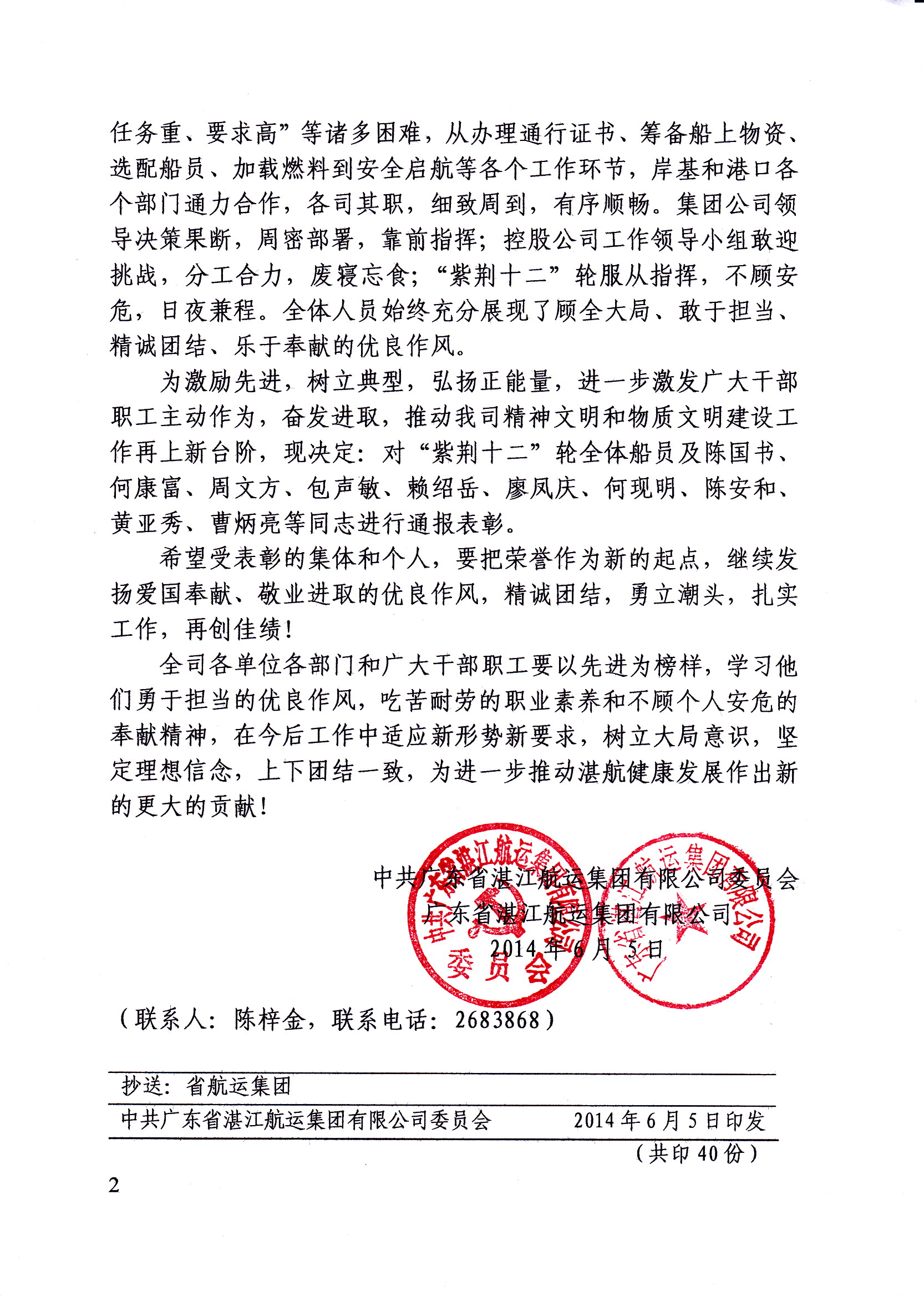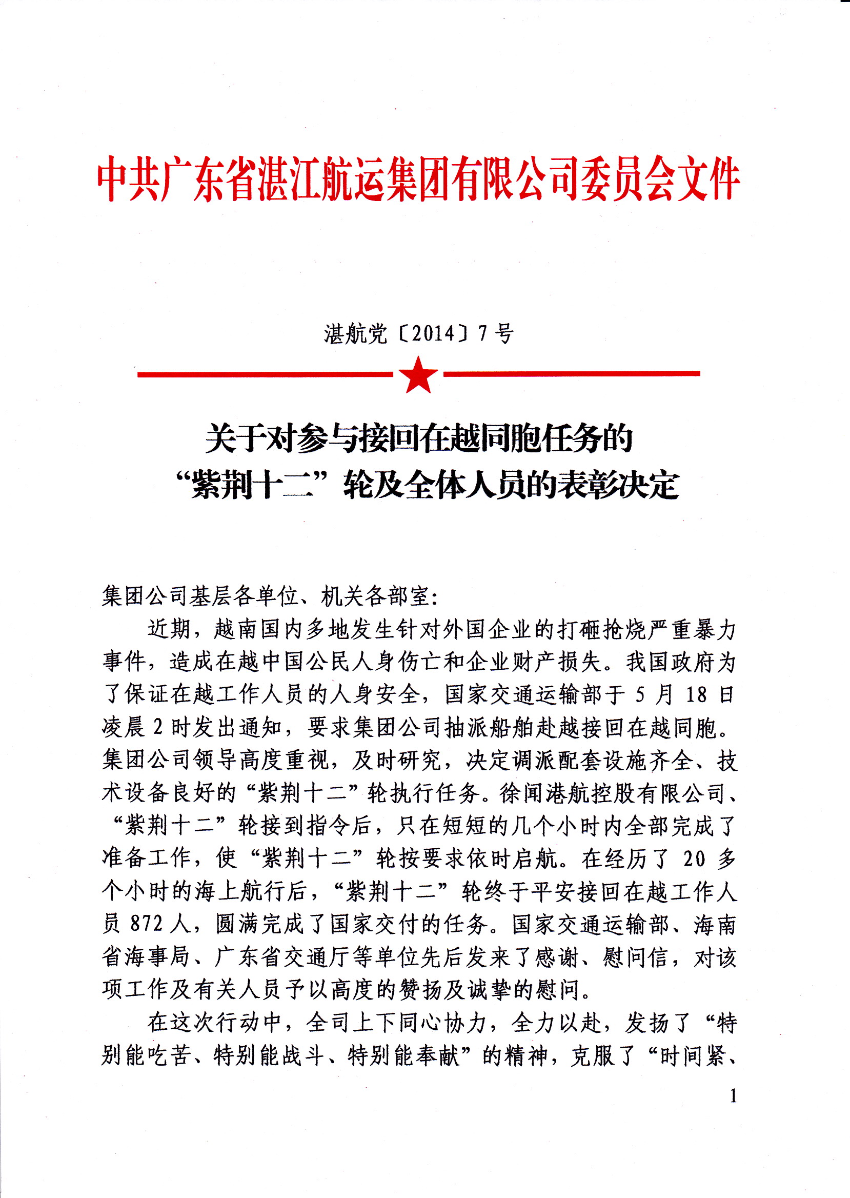 关于对参与接回在越同胞任务的“紫荆十二”轮及全体人员的表彰决定