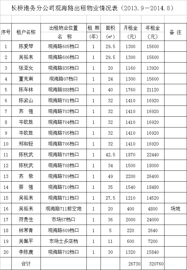 我司20个出租档口物业原租赁合同到期,原租户提出续租意向,经分公司班子会议研究,拟同意续租一年,即从2013年 9月 1 日起至 2014年 8 月 31 日止,租金不变。现予公示,公示期2013年9月22日至9月28日,如有不同意见可书面向分公司行保部反映。