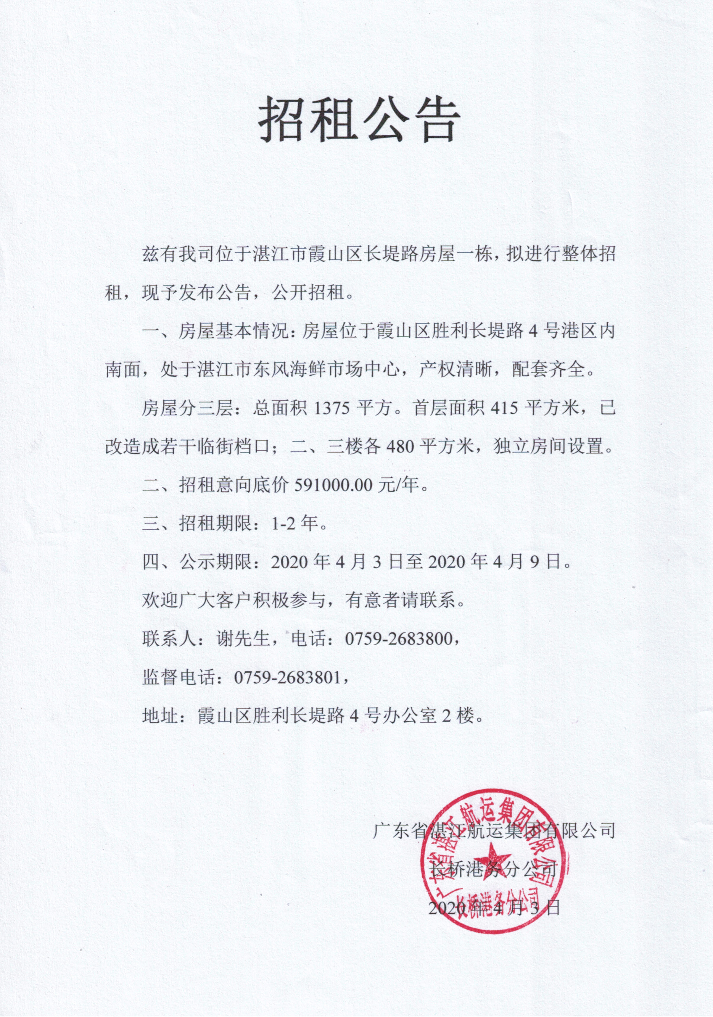 招租公示(长堤路房屋1栋)