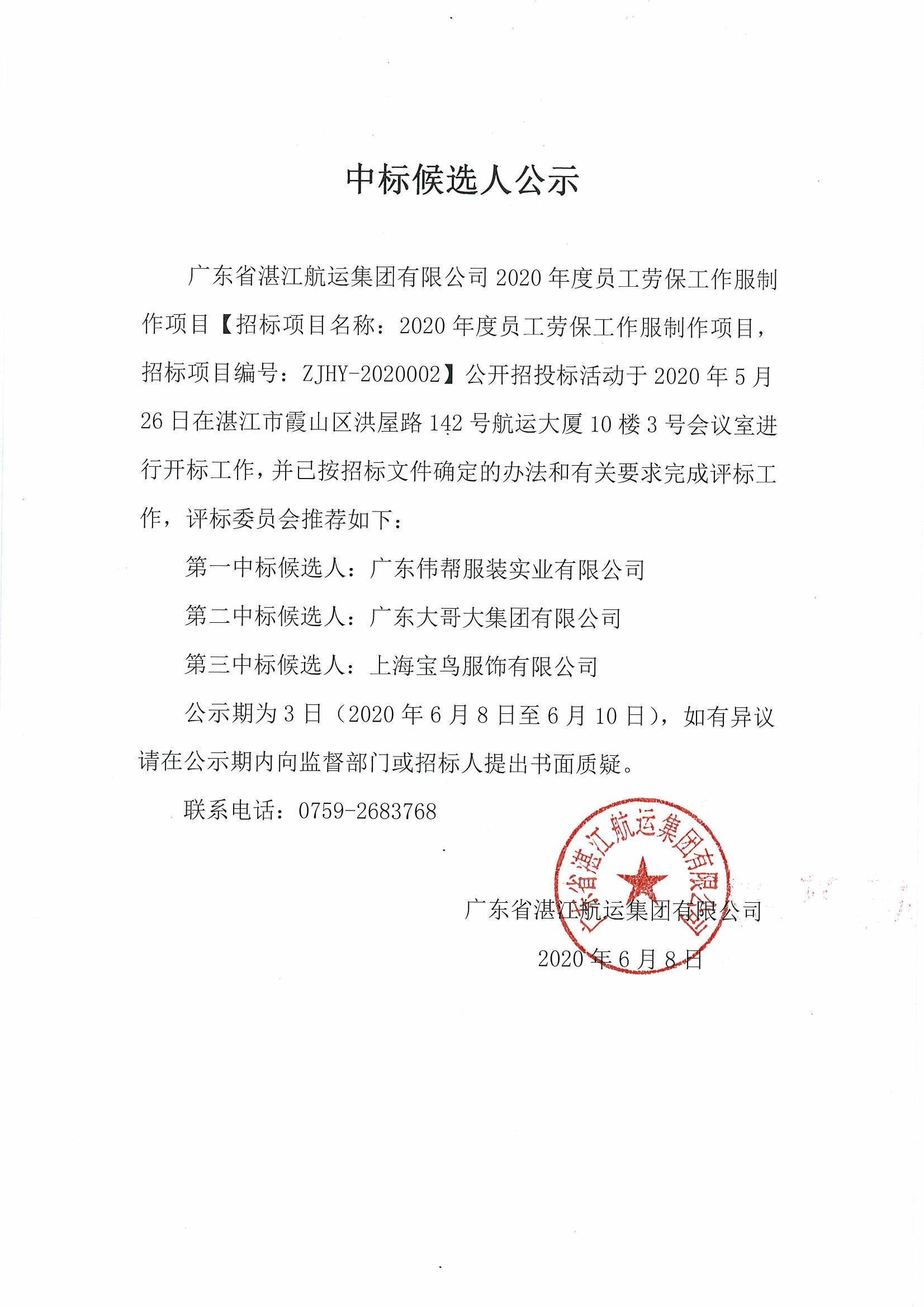 中标候选人公示(2020年度员工劳保工作服制作项目)