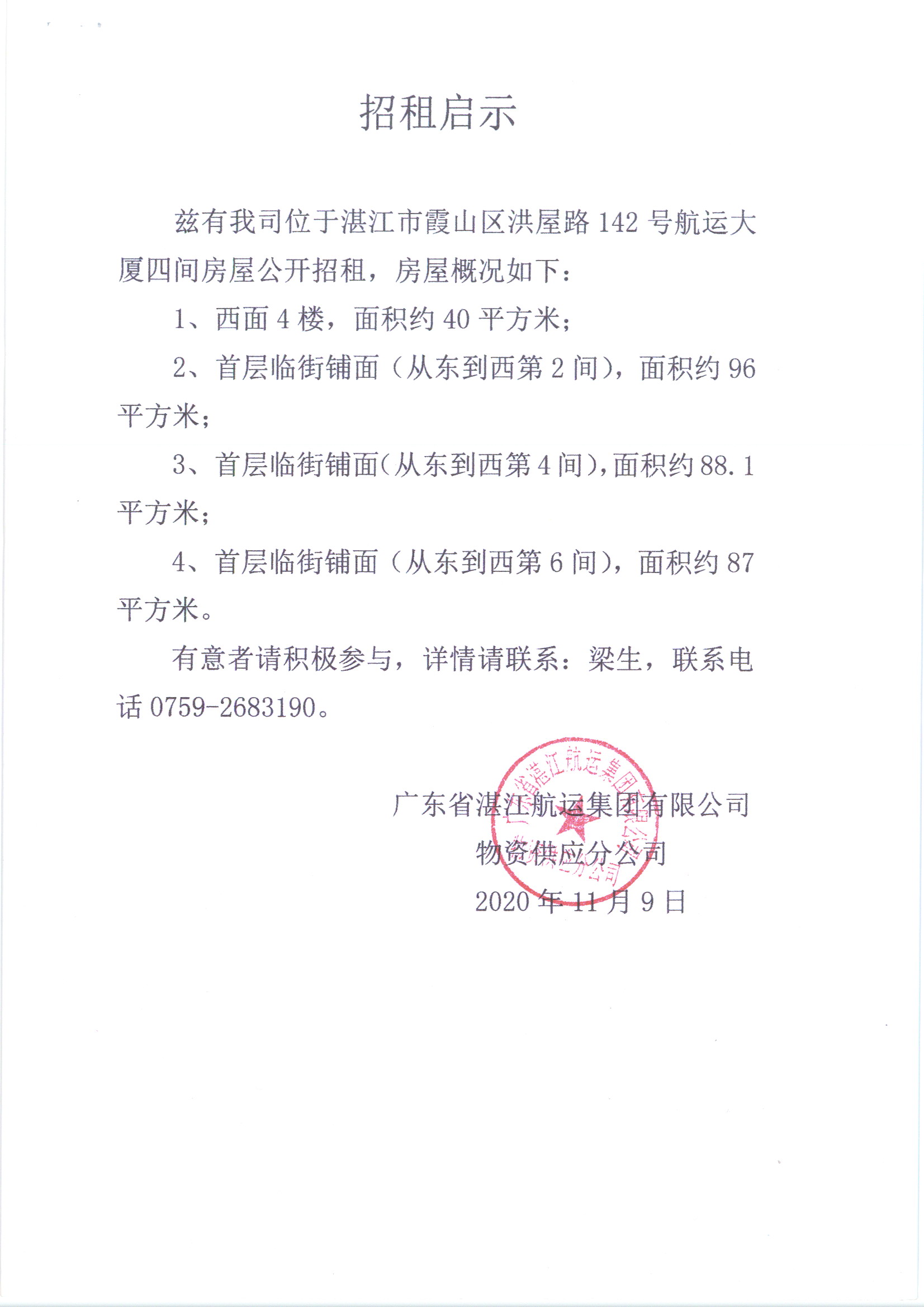 招租启示(2020年11月9日)