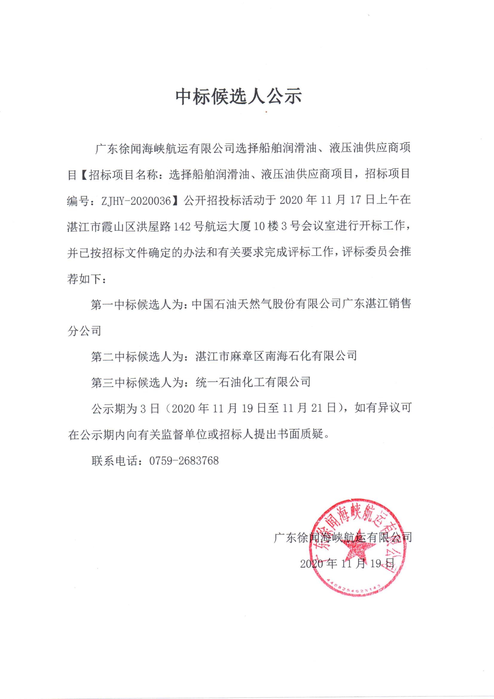 中标候选人公示(船舶润滑油 液压油)