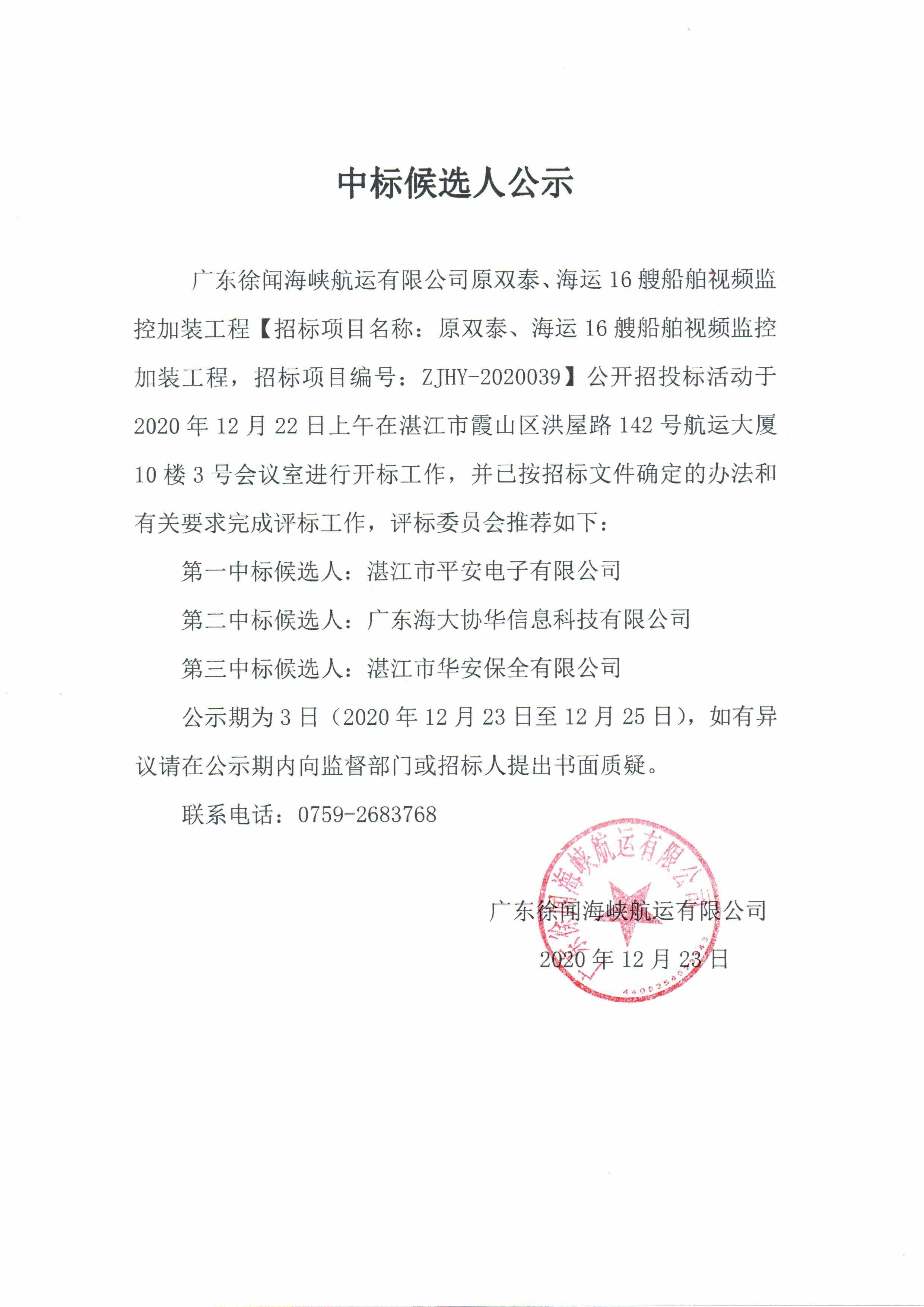 中标候选人公示(船舶视频监控加装工程)