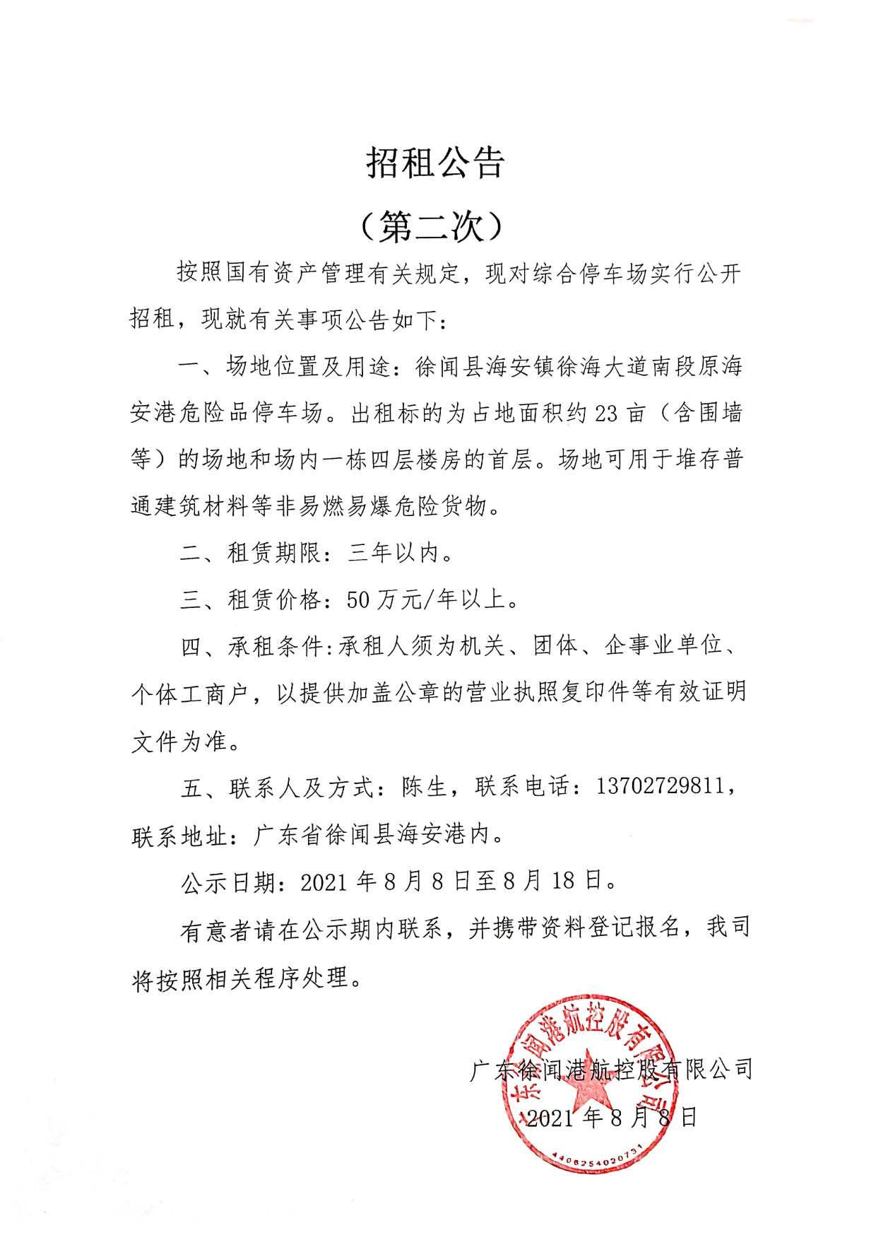 招租公告(原海安港危险品停车场)第二次