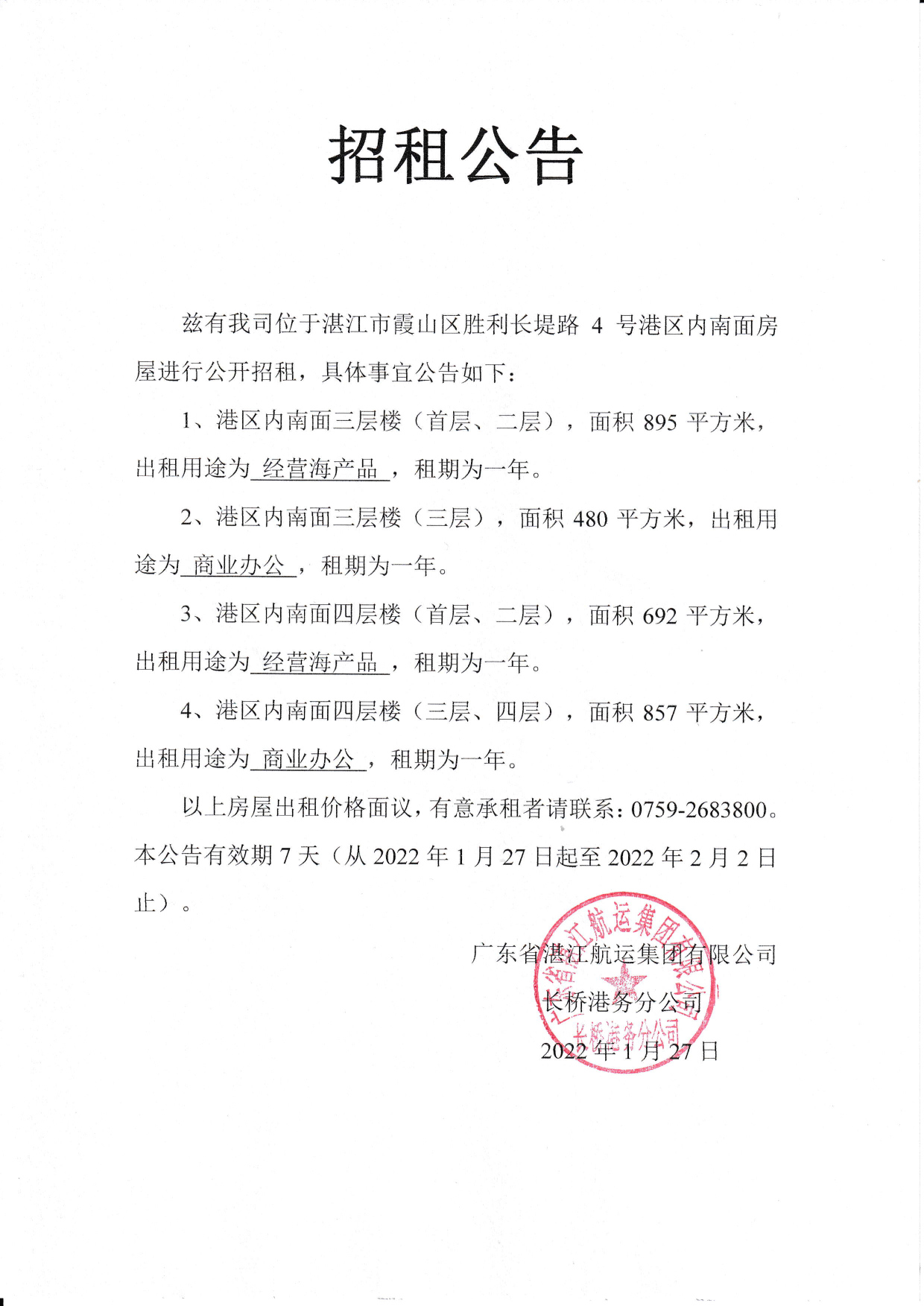 长桥港南面房屋招租公告