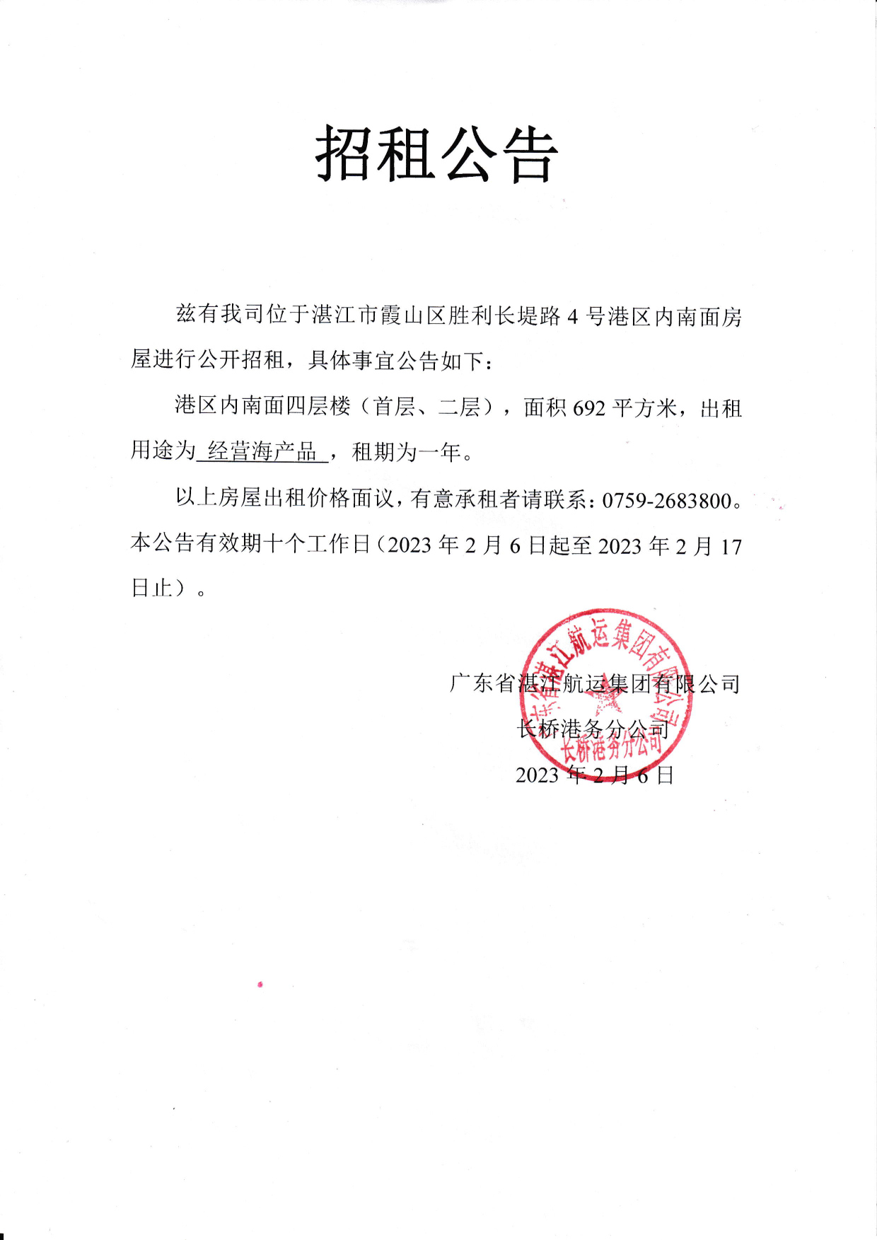 长桥港港区内南面四层楼(首层、二层)招租公告