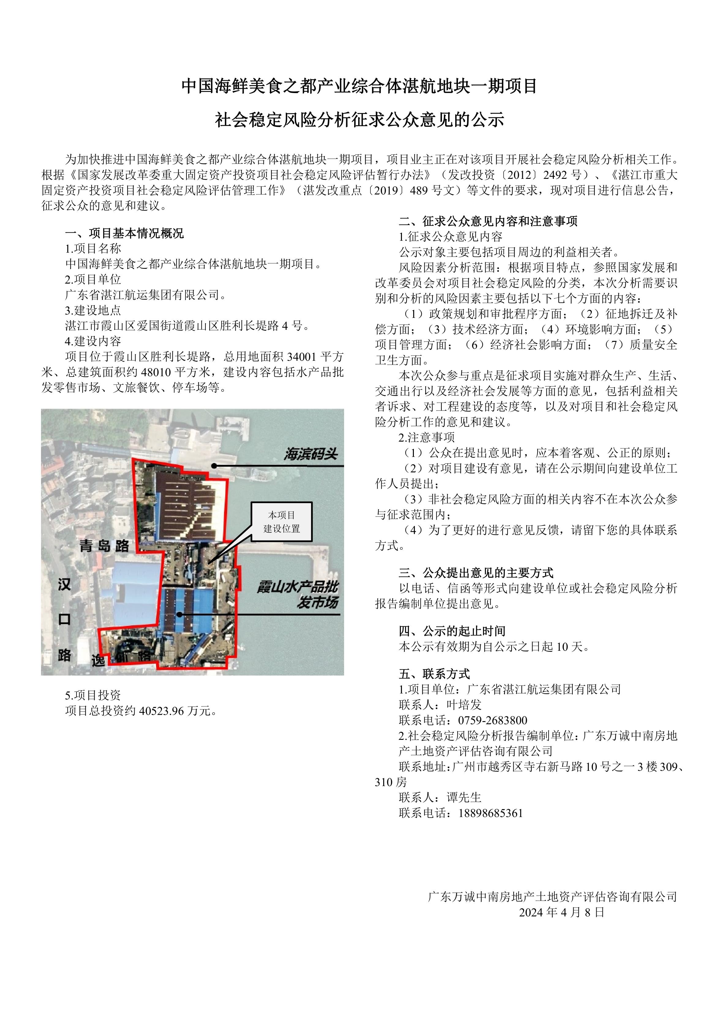 中国海鲜美食之都产业综合体湛航地块一期项目社会稳定风险分析征求公众意见的公示