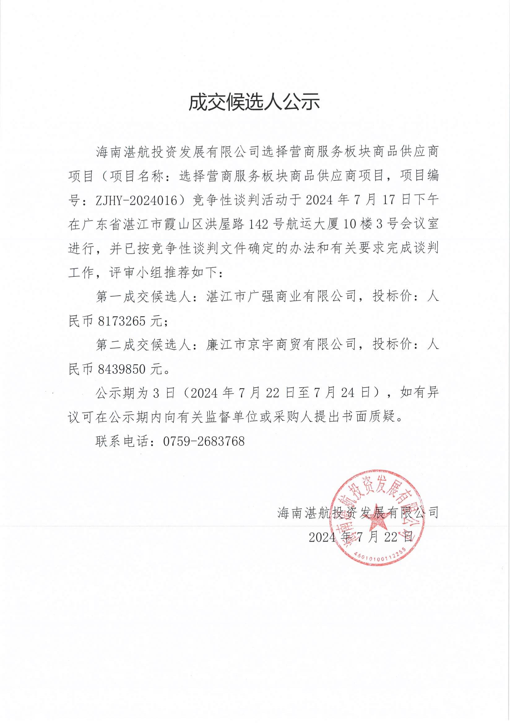 成交候选人公示(选择营商服务板块商品供应商项目)