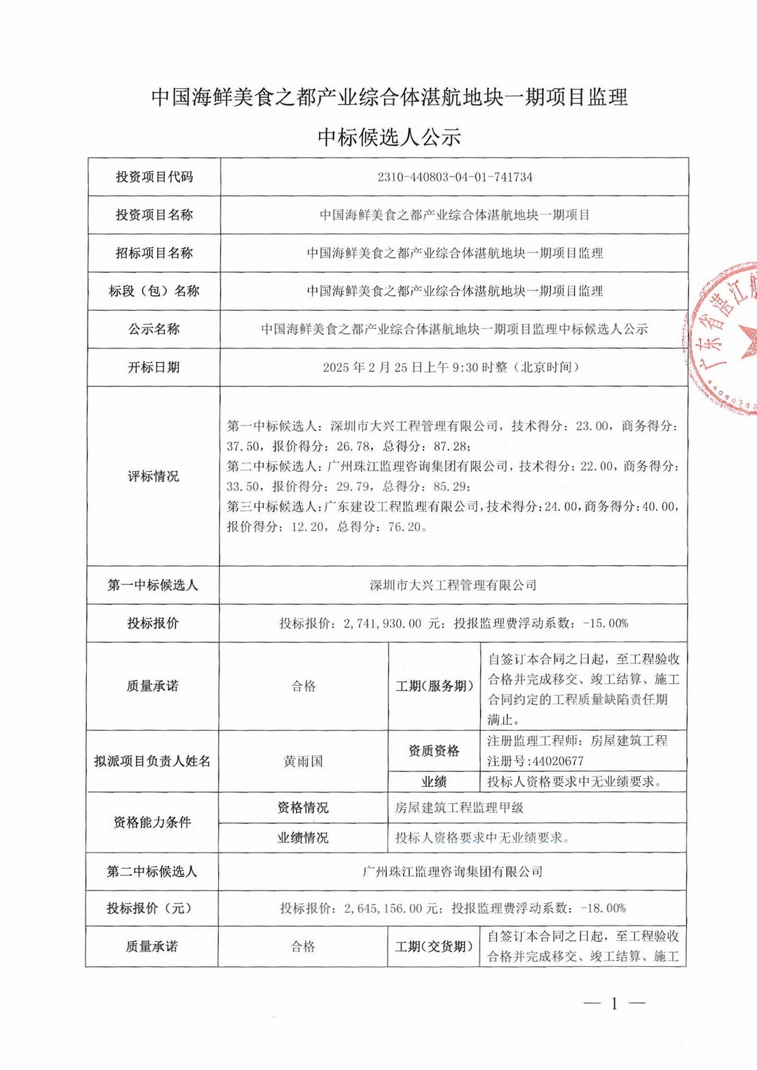 中国海鲜美食之都产业综合体湛航地块一期项目监理中标候选人公示