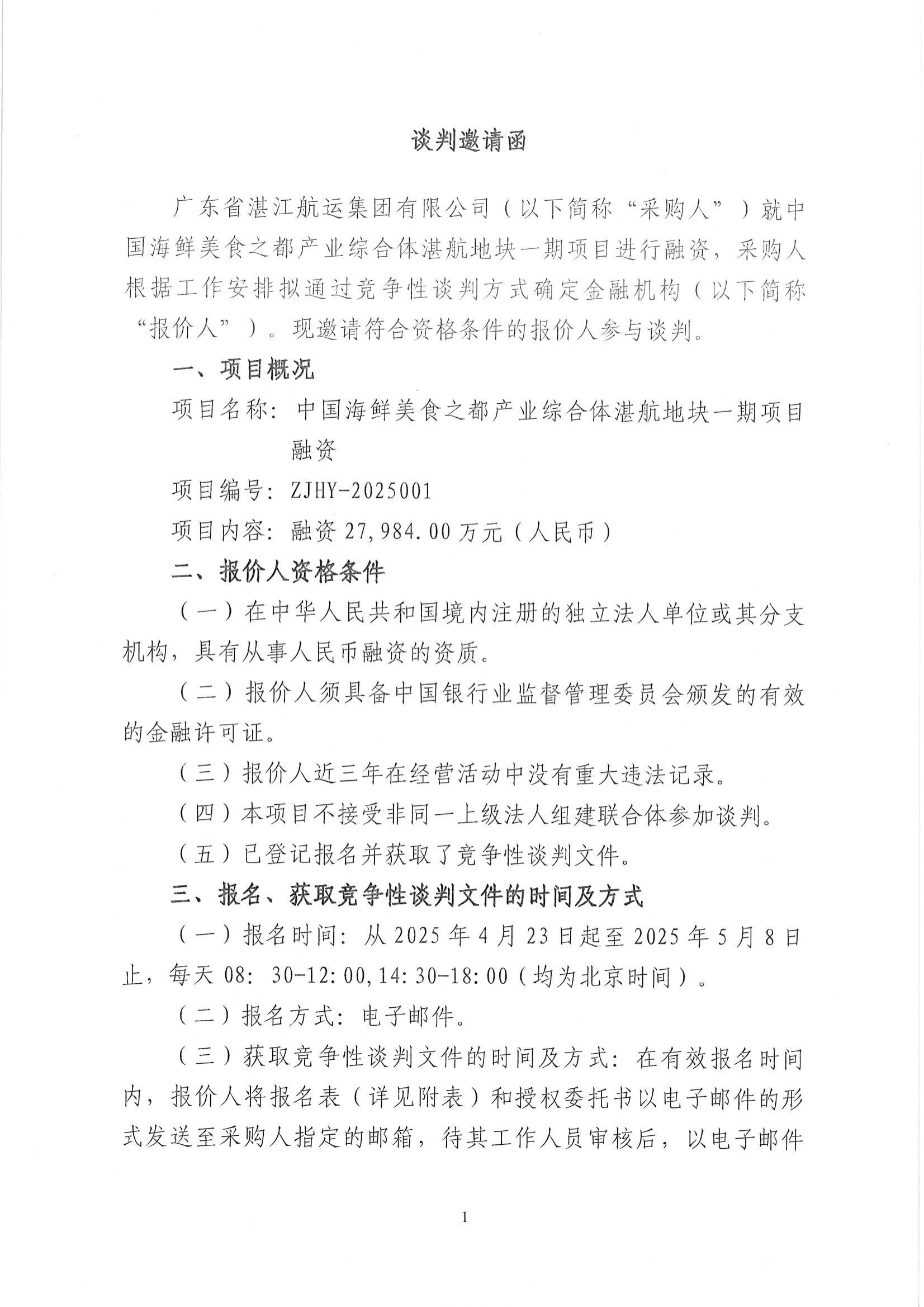 中国海鲜美食之都产业综合体湛航地块一期项目融资谈判邀请函