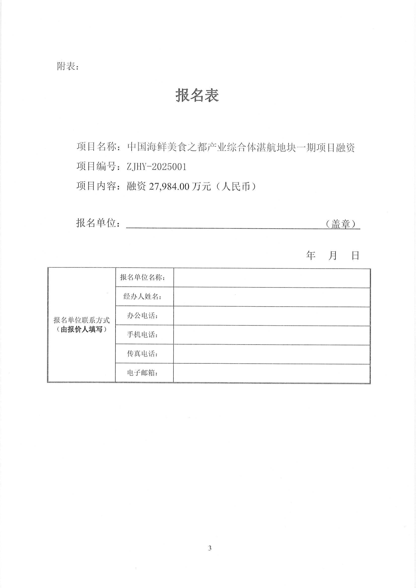 报名表(中国海鲜美食之都产业综合体湛航地块一期项目融资)
