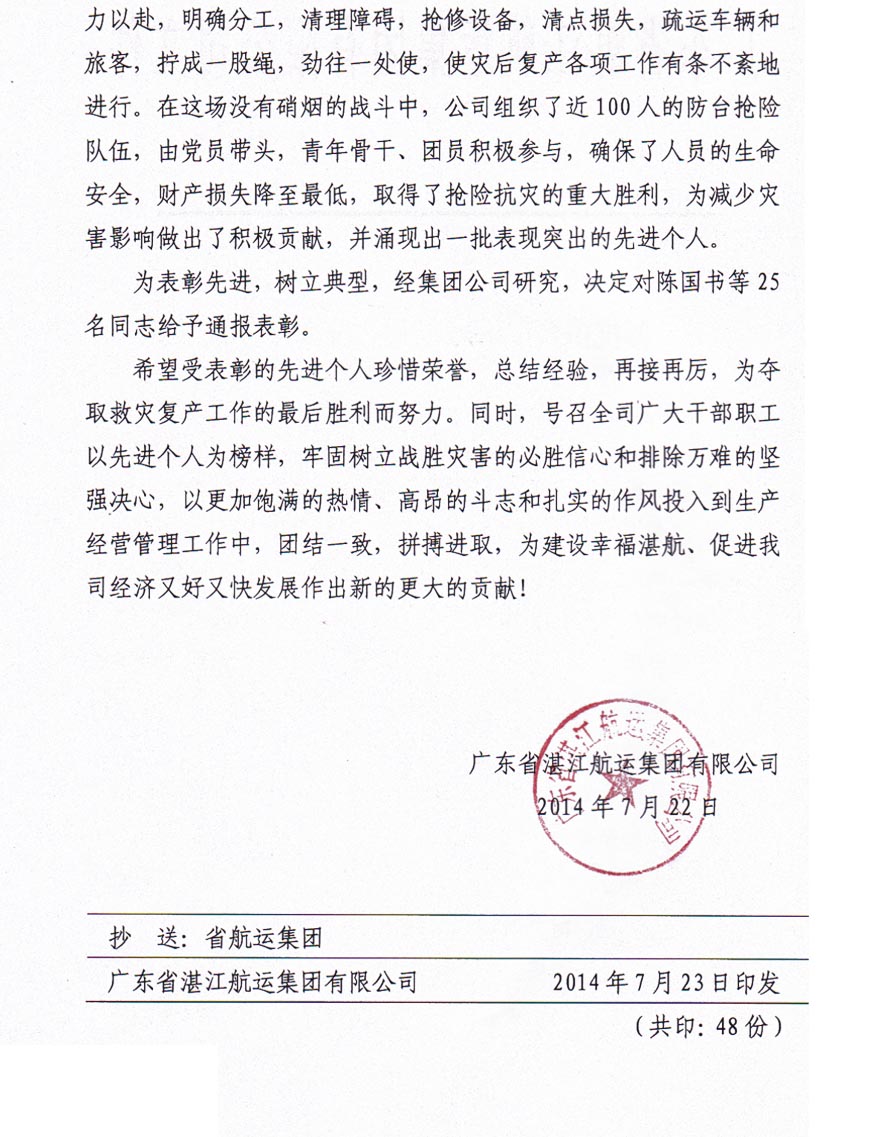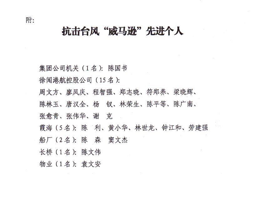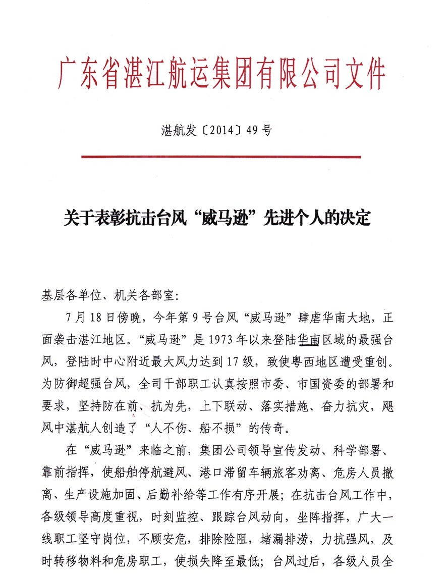 关于表彰抗击台风‘威马逊’先进个人的决定