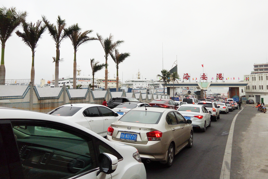 春运期间海安港生产繁忙而有序,图为车辆有序排队进港登船。