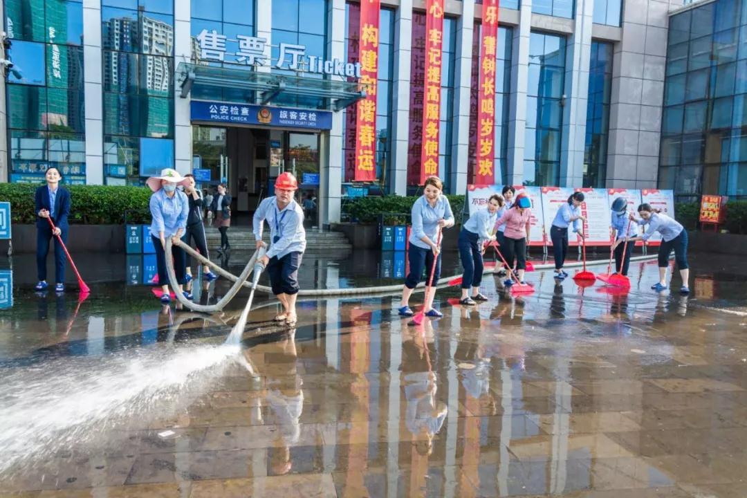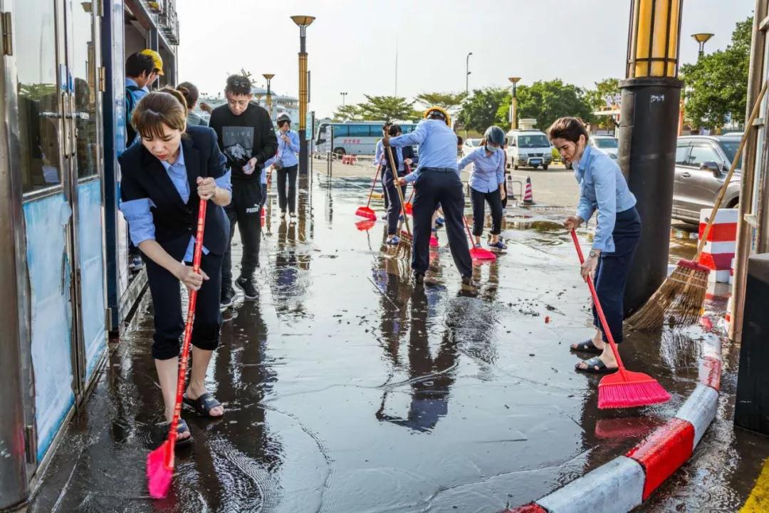 志愿者们对大楼前的广场展开了地毯式的清洗,不放过任何一个卫生死角。在清扫过程中,还贴心地安排人员引导旅客避开水源,避免被淋湿。路过的旅客看到着装整齐的志愿者们卖力地打扫港区卫生,纷纷投来赞许的目光。