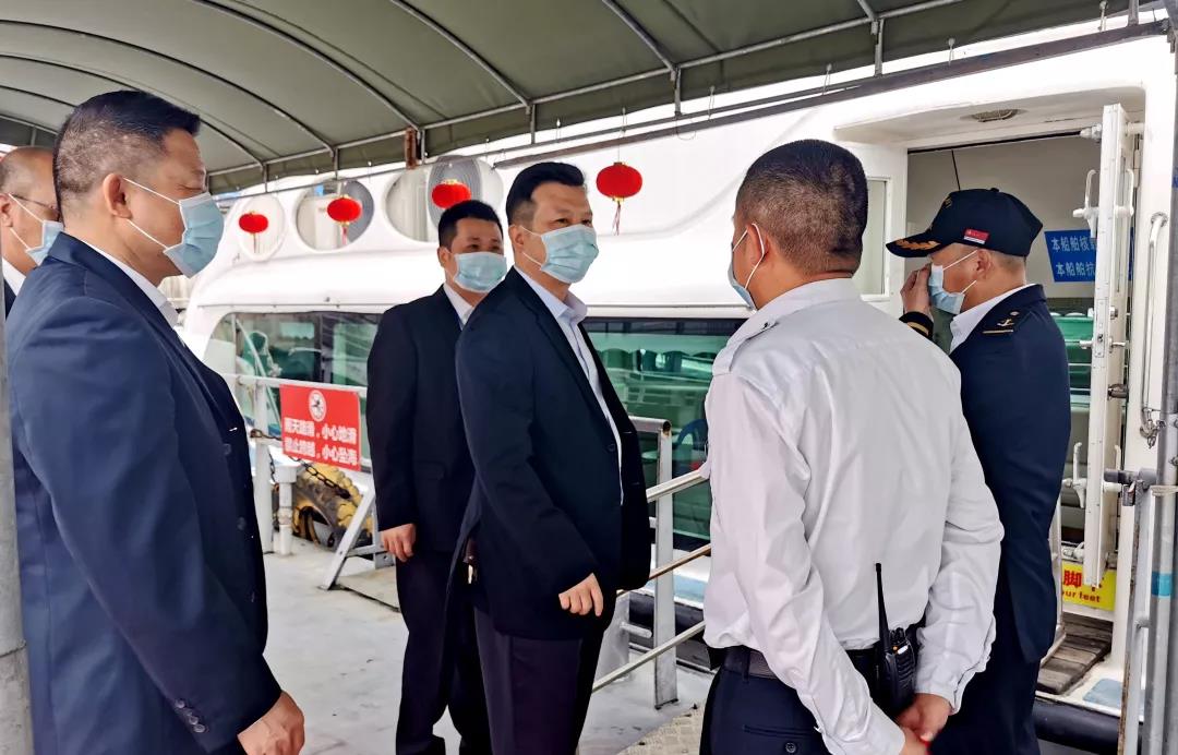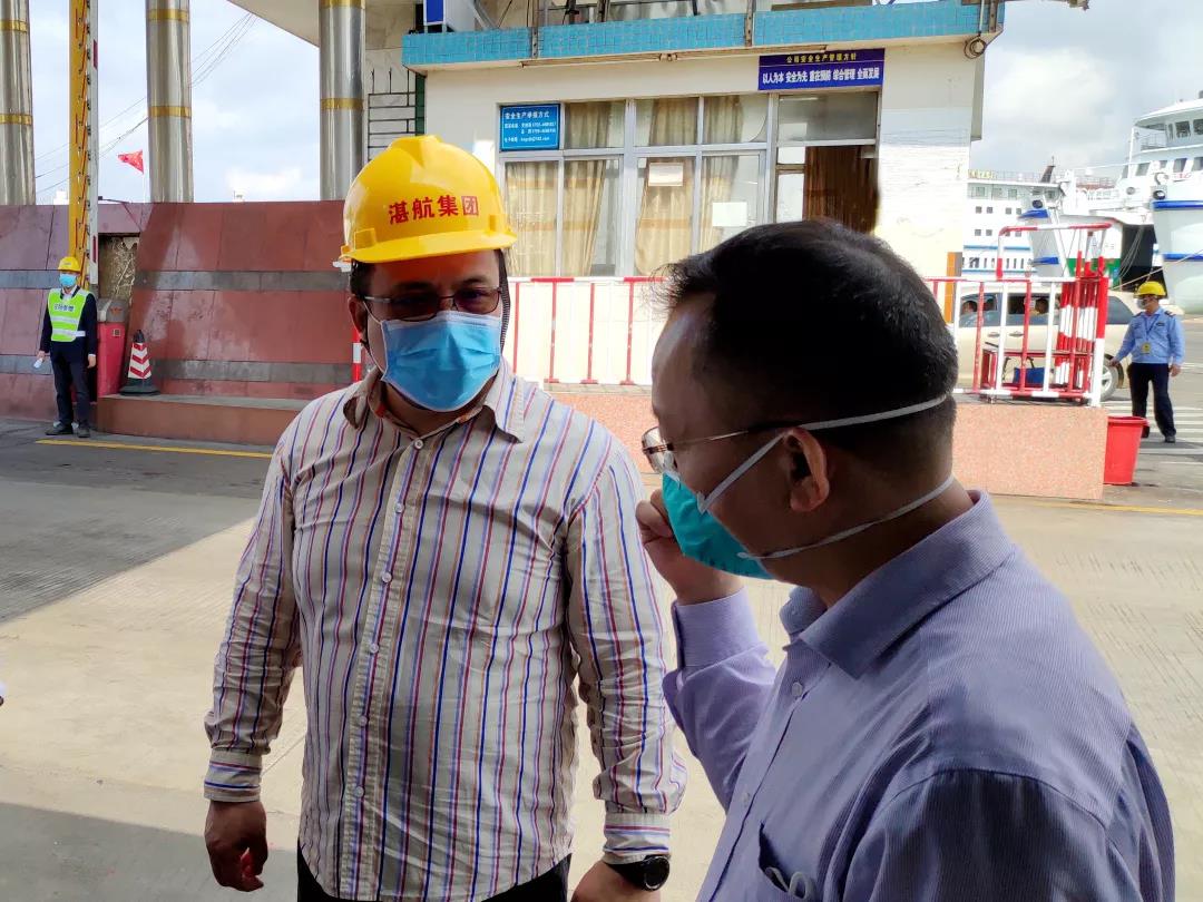 一大早,在徐闻海安驻点值班的省航运集团总经理张道武来到港口和船舶一线岗位,现场检查督导新冠肺炎疫情防控工作,强调要提高思想认识,加强疫情防控,强化现场管理,做好员工防护措施,做足防御准备,确保员工生命安全和健康,保障琼州海峡民生大通道安全畅通。