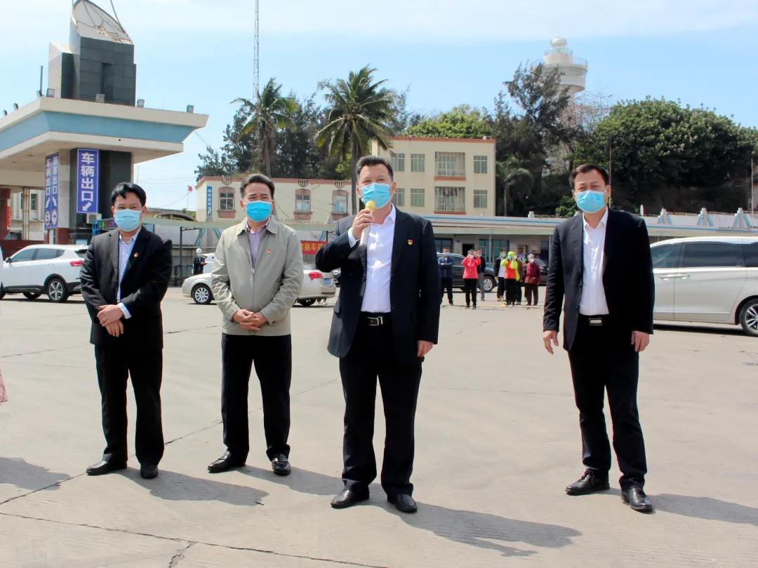 2月27日中午12时许,av影片 “紫荆十二号”轮缓缓停靠海安港,100多名徐闻驻海口疫情防控工作组队员有序走下码头。徐闻县委常委、常务副县长陈弘祖、县委常委、统战部部长周仔洪、副县长许彩娟和av影片 党委副书记、总经理汪万泉率队在码头迎接。