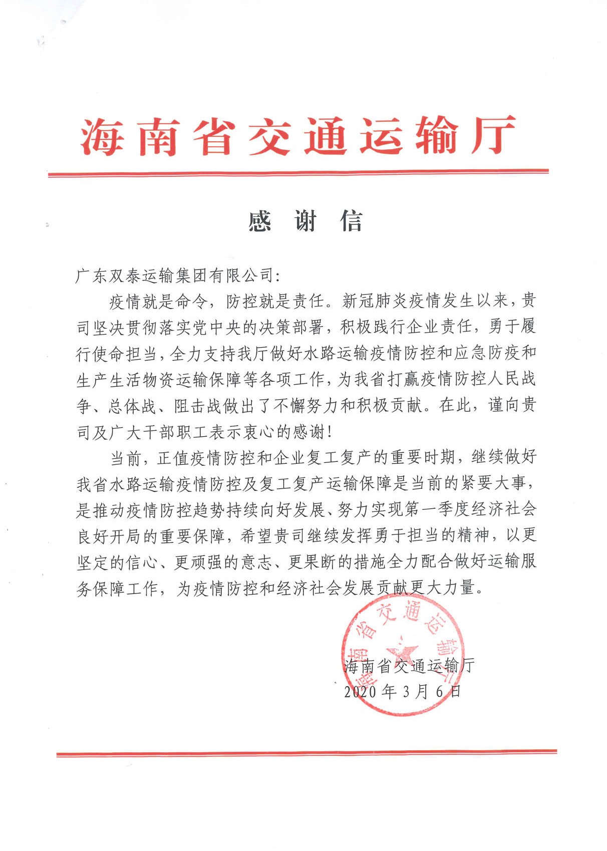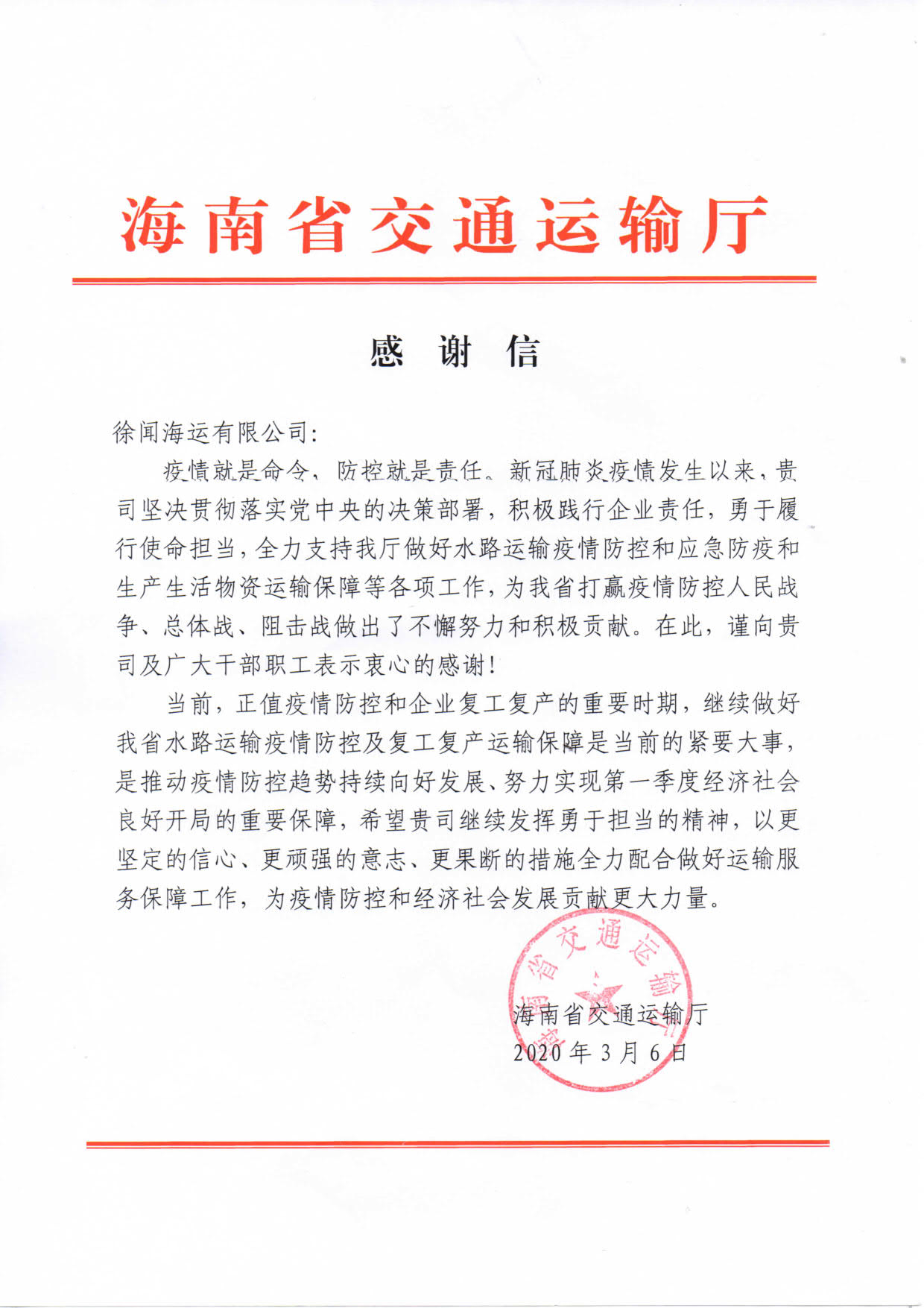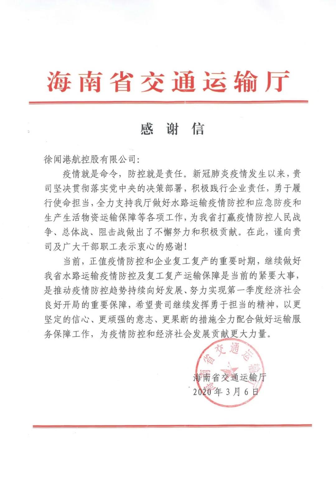 一封封感谢信,一份份战“疫”情。近日,av影片 旗下徐闻港航公司、广东双泰集团、徐闻海运公司陆续收到海南省交通运输厅发来的感谢信,信中对各公司积极践行企业责任,勇于履行使命担当,全力支持海南省交通运输厅做好水路运输疫情防控、应急防疫和生产生活物资运输保障等各项工作给予肯定,并对助力海南省打赢疫情防控人民战争、总体战、阻击战做出的不懈努力和积极贡献表示衷心感谢。此外,3月23日,av影片 旗下海安港、海安新港也分别受到海口市新冠肺炎疫情防控工作指挥部赠予锦旗表扬。