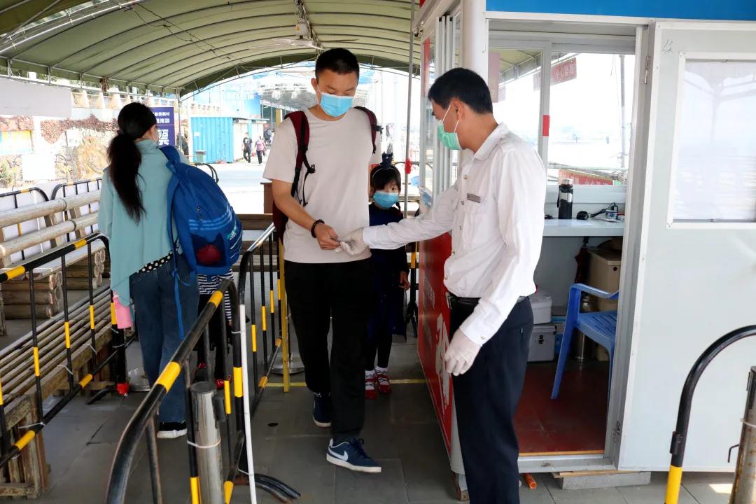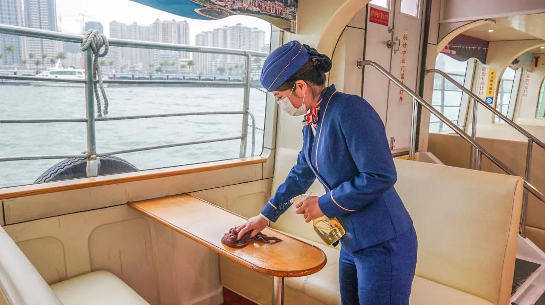 为做好复航工作,保障游客健康和安全,红嘴鸥游船公司增加了直接接触区域消杀频次,实行实名制登记、无接触购票、限制载客流等措施,要求所有游客全程佩戴口罩,登船前出示“粤康码”,进行体温检测,在现场工作人员的指引下分批登船。在游船上,工作人员引导游客在客舱及甲板等区域分散活动,避免聚集,并给每位游客送上贴心小礼物。