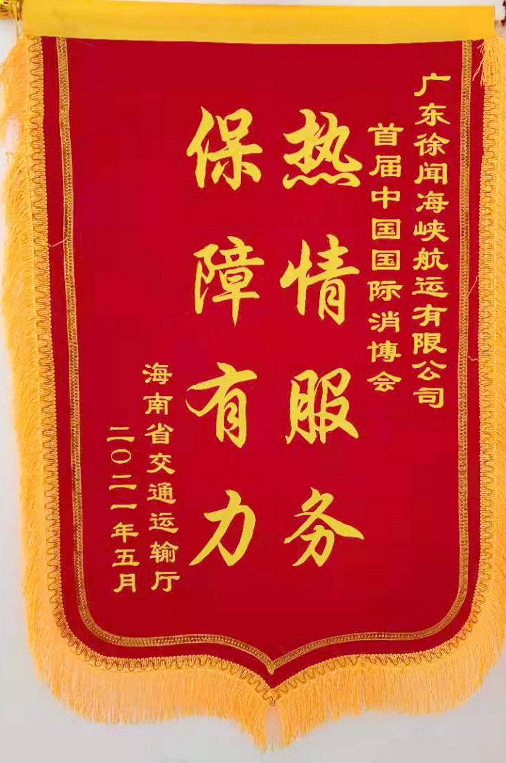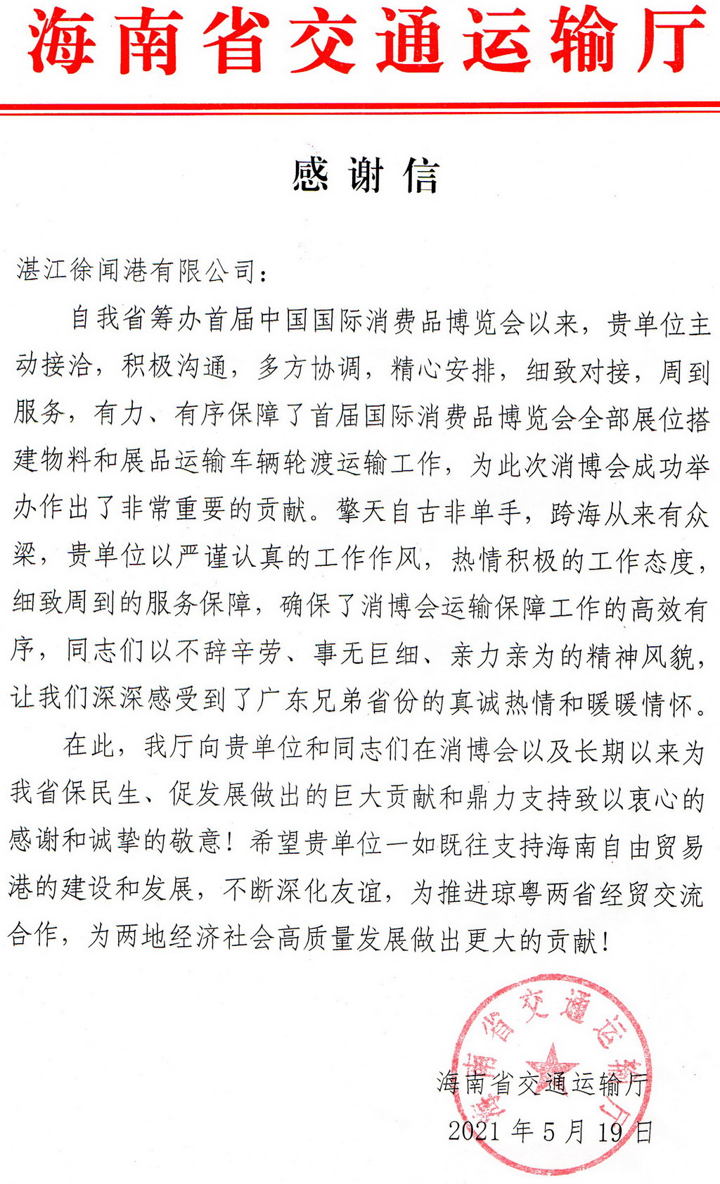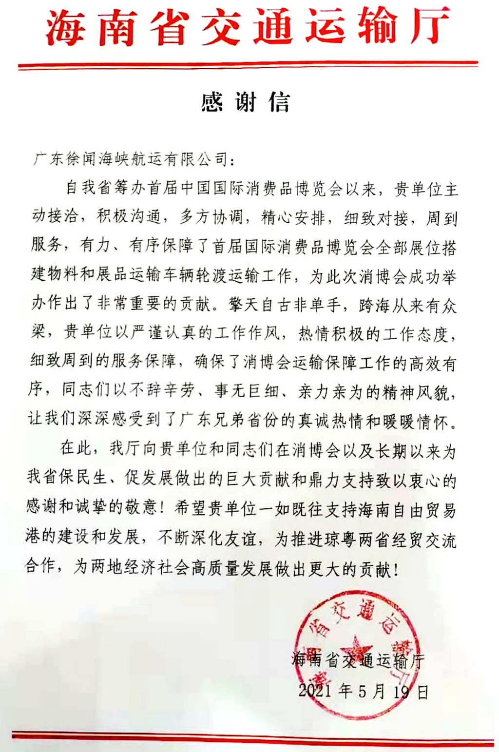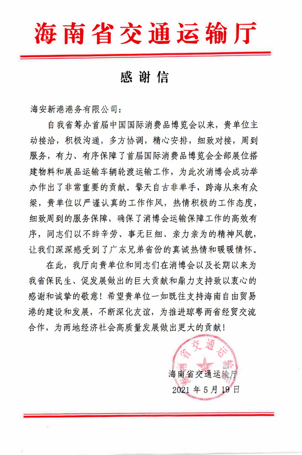 5月21日,av影片 旗下广东海峡公司、徐闻港、海安新港分别收到海南省交通运输厅发来感谢信和锦旗表扬。感谢信中,海南省交通运输厅对各公司在海南省首届中国国际消费品博览会期间,为物资运输车辆提供高效、快捷的工作给予肯定,并表示衷心的感谢和诚挚的敬意。