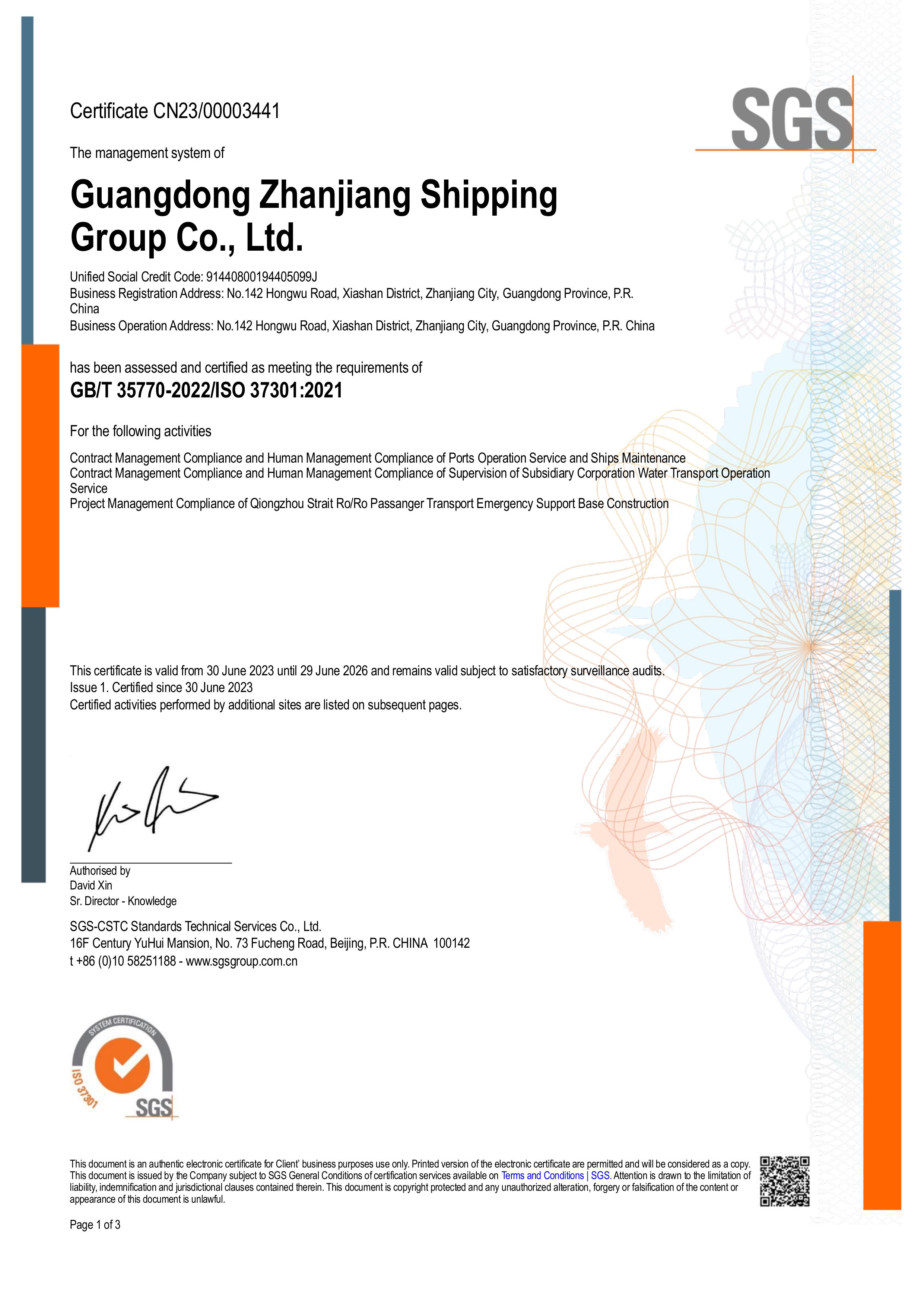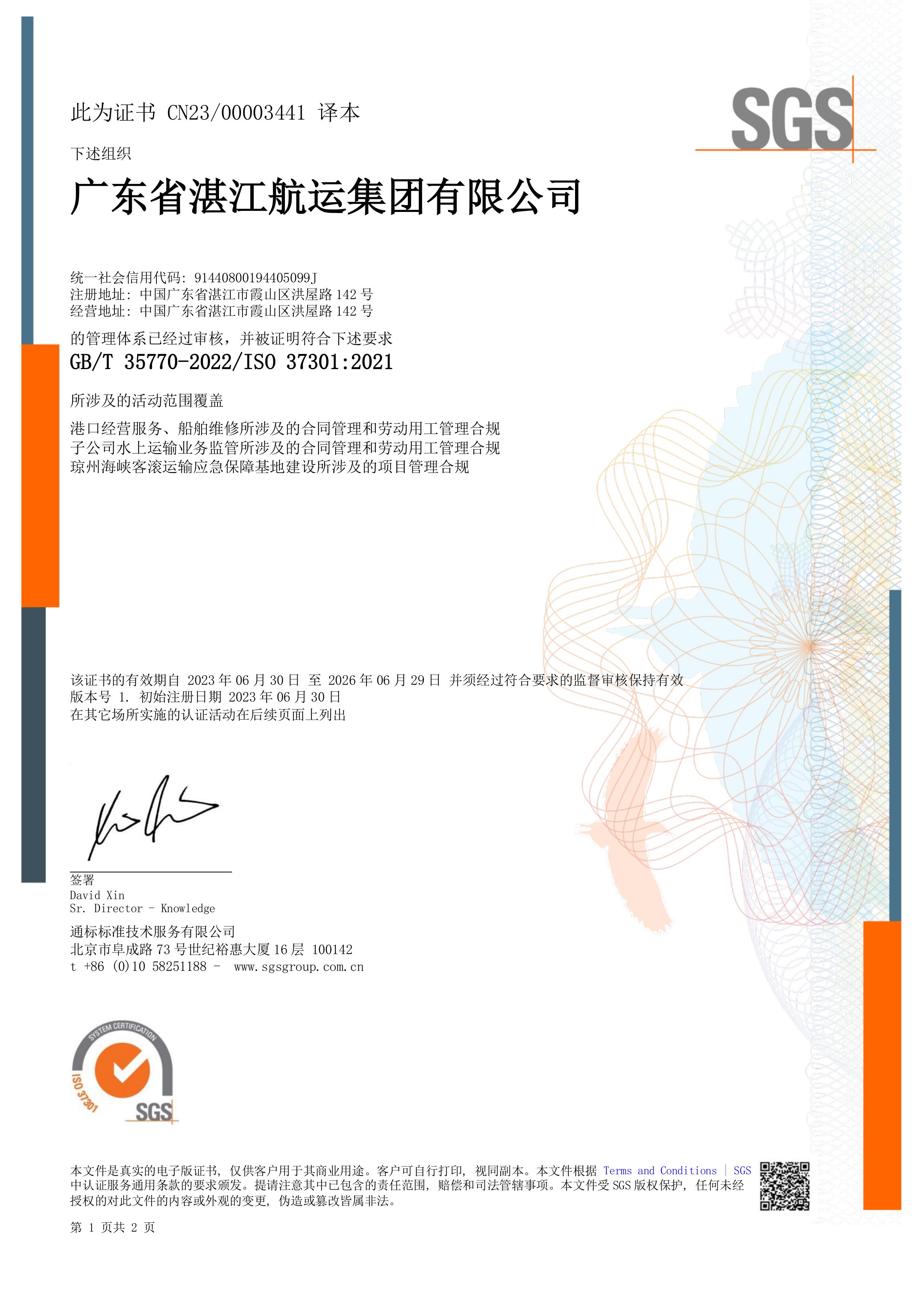 6月30日,av影片 成功获得通标标准技术服务有限公司(SGS)颁发的ISO37301:2021和GB/T35770-2022合规管理体系认证证书,这是在国家标准GB/T35770-2022出台后,省港航集团系统内除本部外首张ISO37301:2021和GB/T35770-2022双标准认证证书,也是湛江地区第一张双标准认证证书。