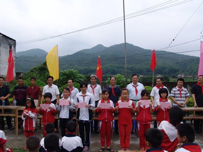 11日下午2点,上村小学的教师和学生们坐成了整齐的方阵,与集团第四支部一起举办了简单而融洽的助学活动仪式。当党员们将6把风扇、6台录音机、111个装好了铅笔、橡皮、尺子等的文具盒以及练习簿、笔袋等送进小学时,上村村小学的学生们使劲地鼓掌欢迎。上村小学校长朱建华主持了仪式,他对集团积极支持该村小学的建设表示了由衷的感谢之情。集团机关党委副书记黄远荣同志在仪式上讲话,他说,小学教育是人生中的重要阶段,希望同学们珍惜学习机会,努力实现理想。随后,小学生们为集团第四支部的党员们佩戴上了鲜艳的红领巾,集团本部第四支部书记张穗生同志代表支部为学校教师送上了慰问金,并为8名优秀学生颁发了奖学金。在朱建华校长的陪同下,第四支部一行还参观了学校教室、实验室、客家文化陈列室等。