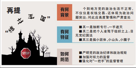 近日公布的中央纪委十八届六次全会有关文件再提“独立王国”,引起广泛关注。从已查处通报的一些案件来看,“独立王国”现象并不少见,影响极为恶劣。所谓“独立王国”,都有哪些特征?中央强调“任何人不得搞‘独立王国’”,给谁敲响了警钟?