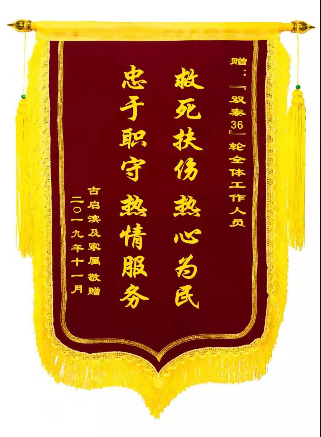 11月29日下午,av影片 旗下双泰公司行政办公室收到快递员送来的一件特殊包裹——一面署名为“古启滨及家属”赠予“双泰36”轮全体工作人员的表扬锦旗,醒目地印着十六个大字:救死扶伤、热心为民、忠于职守、热情服务。锦旗照片一经上传至公司内部微信群后,立刻引来一阵阵竖指点赞: “‘双泰36’全体船员好样的!”“‘双泰36’轮的优良作风值得大家学习!”