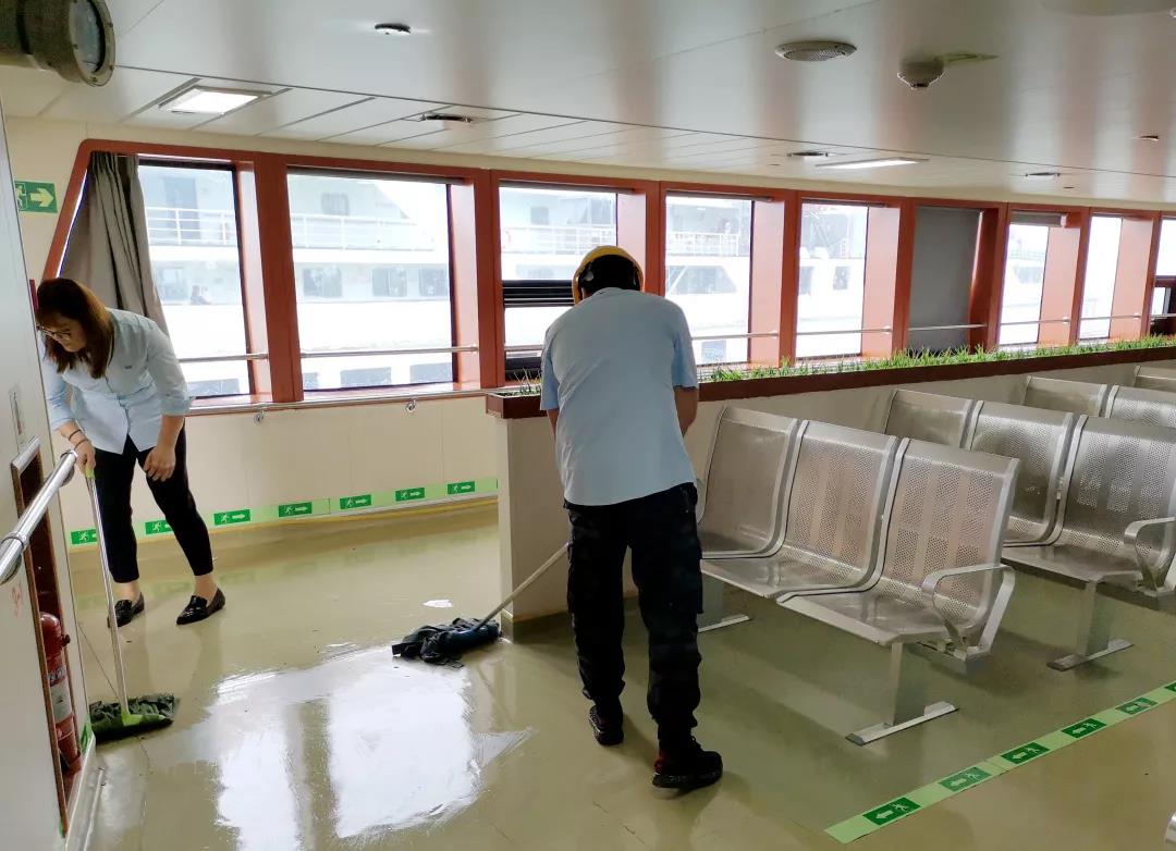 为了让乘客满意出行,双泰公司全司动员,成立11个清洁小组,分别与11艘双泰船舶结对帮扶,清洁小组工作人员时刻关注着自己负责清洁的船舶航班,每天都在等待船舶回港,然后登船与船员一起在客舱拖地抹窗,清洗厕所和走廊,保持窗明几净,营造出舒适的坐乘环境。